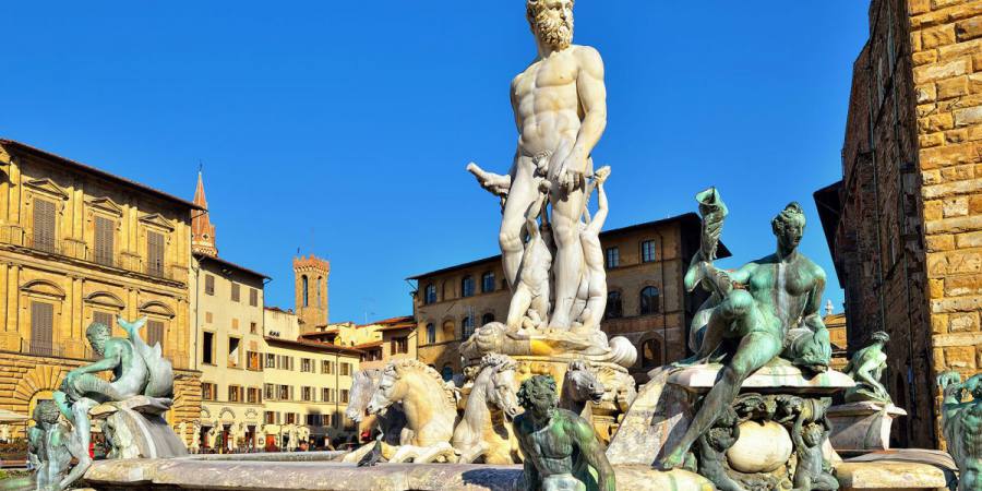 领主广场因周围的精美建筑而被认为是意大利美丽的广场之一。始建于十三、十四世纪,最初是在被拆除的乌贝蒂、佛拉伯斯基及其他皇帝派家族的房地基上建起来的,后来经过扩建形成今天的规模。广场上有众多雕塑精品——米开朗基罗的大卫(复制品)、海神喷泉、柯西莫一世骑马雕像、帕尔修斯和美杜莎等。 广场一侧是佣兵凉廊,由面向街道敞开的宽拱组成,宽三个分割间,用于容纳集会的人群并举行公共仪式,例如行政长官宣誓就职,圆拱支撑在在科林斯簇柱之上,这些宽拱颇为吸引佛罗伦萨人,以至于米开朗琪罗甚至提议环绕整个领主广场。
