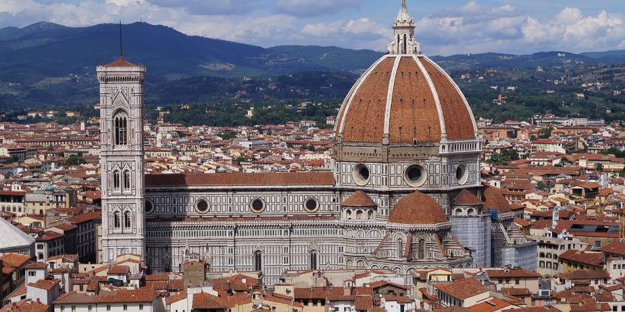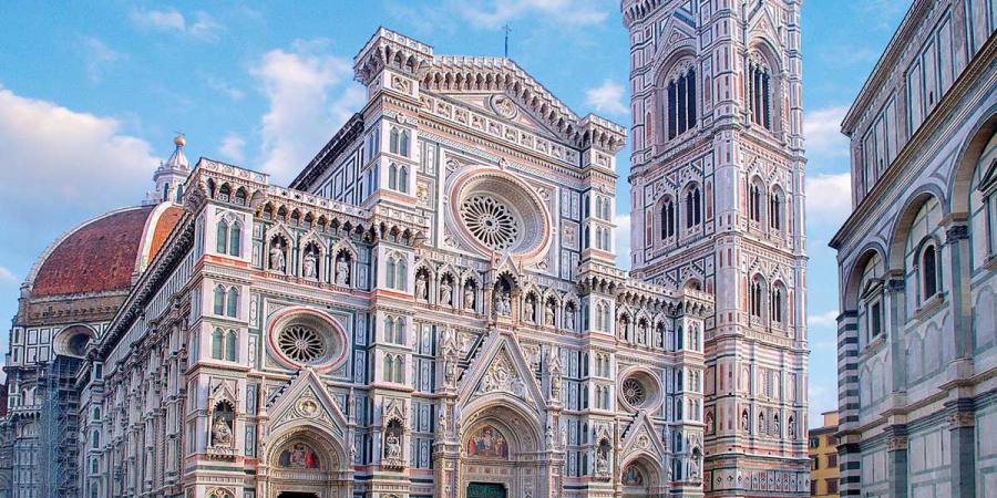 参观圣母百花大殿、圣若翰洗礼堂、乔托钟楼 步行10分钟到达佛罗伦萨标志性建筑——百花大教堂。它是天主教佛罗伦萨总教区的主教堂,也是市内较高的建筑,登上教堂的463级台阶可俯瞰佛罗伦萨的全景。佛罗伦萨在意大利语中意味花之都。这里是世界五大教堂之一,曾被评为世界美丽教堂。诗人徐志摩把它译作“翡冷翠”。是整个文艺复兴初期的代表性建筑。红、绿、白外观装饰精美。建筑群由主教堂、钟楼和洗礼堂构成,规模宏大。最引人注目的是中央穹顶,这是世界上第一大的穹顶之一,其正中央的希腊式圆柱的尖顶塔亭,总计高达107米,使教堂在佛罗伦萨全体建筑中更为醒目。 门票:教堂免费;教堂博物馆和穹顶联票15欧;钟楼6.5欧元;洗礼堂4欧元 司导不陪同进入
