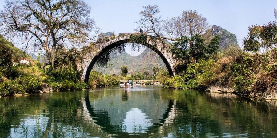【自由漫步-网红打卡点富里桥】富里桥是遇龙河的水源头,是阳朔三大古石桥之一,这座石拱桥建于明朝,经过五百多年风月的洗涤,愈加的古朴,石结构单拱,长30米,宽5米,高10米,富里桥造型精美,半圆的石拱桥,和水中的倒影相得益彰,形成一轮满月。桥上是观赏田园风光的最-佳处,青山环抱,绿水绕庄。