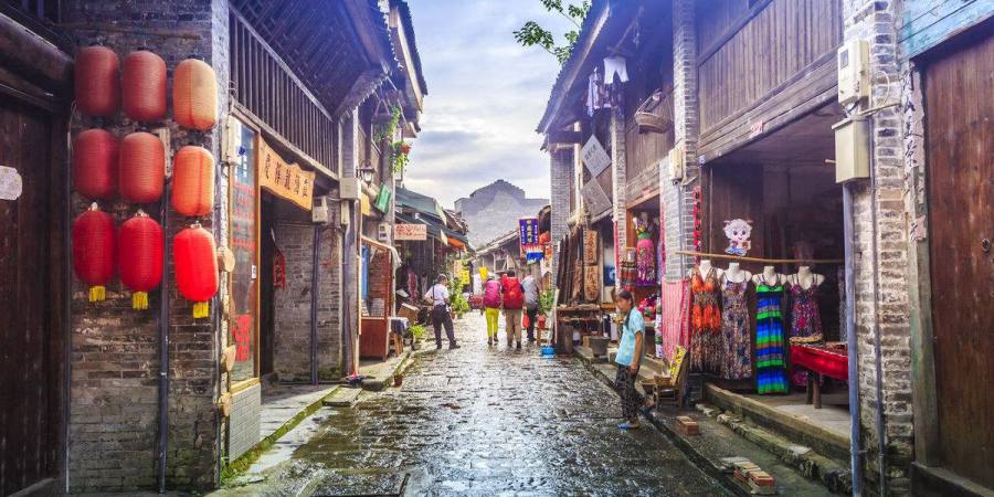 自由漫步在一条长1公里多的石板街,东南至漓江榕树潭、古渡码头,会馆建筑于古街的两旁,现各类砖瓦结构的古建筑大部分保存完好。