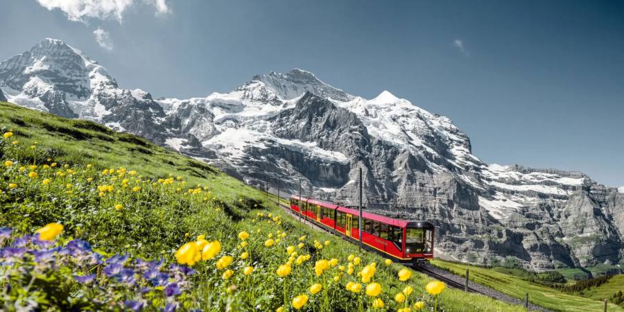 在少女峰顶乘坐火车从格林德瓦一侧下山 火车到克莱纳谢德格(Kleine Scheidegg)转红色小火车到格林德瓦 从小夏戴克到格林德瓦下山火车约40分钟,快到格林德瓦时可以看到有名的梦幻山坡,梦幻山坡位于Grindelwald小火车站附近,从少女峰下山前往Grindelwald的火车上就能沿路观赏到梦幻山坡,在火车上观景打卡,当天根据时间选择是否停留游玩格林德瓦小镇。