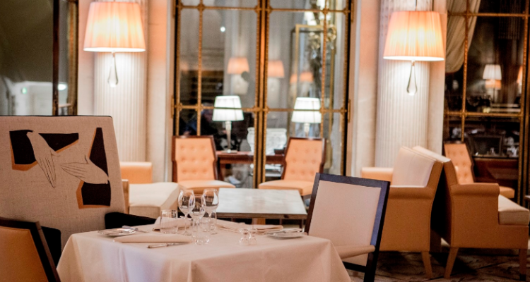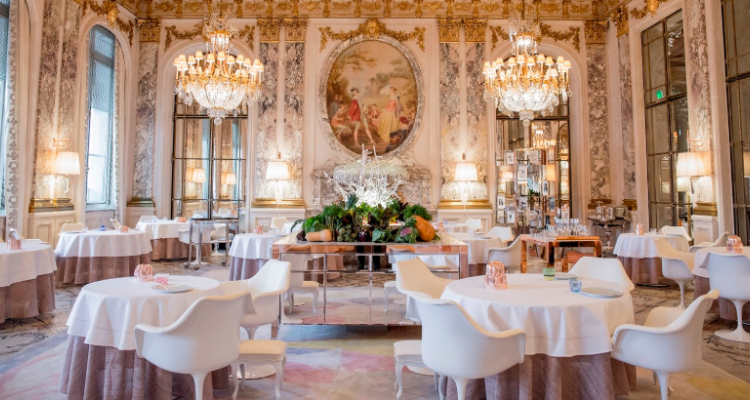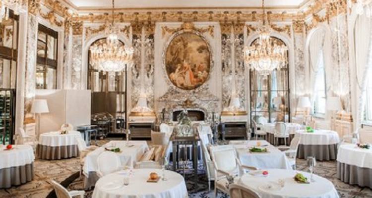这家著名的米其林二星餐厅坐落于著名的杜乐丽花园对面。餐厅位于一座著名的宫殿式聚会所,该宫殿诞生于 19 世纪初,餐厅装潢简约而奢华,白雕花加镀金天花板,高级奢华水晶吊灯,古典马赛克装饰加上精致的壁画,无不渲染着一种高贵奢华的气氛。 想像着,在这可以与凡尔赛宫装饰媲美的餐厅里,服务生端着银质花纹托盘伴着芭蕾舞歌剧乐带着轻盈的步伐为您服务,这无不是一种高级而奢侈的享受。
